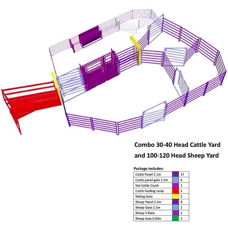 The Combo 30-40 Head Cattle Yard and 100-120 Head Sheep Yard Design is a meticulously crafted solution for farms managing both cattle and sheep. This integrated design ensures optimal use of space and resources, providing tailored areas for each type of livestock. It supports the safe, efficient handling and management of up to 40 cattle and 120 sheep, catering to the unique needs of both.